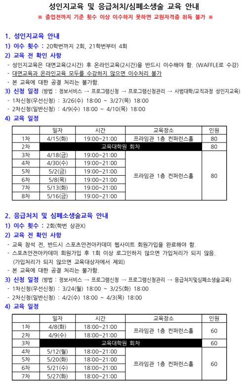 2025학년도 1학기 성인지교육 및 응급처치/심폐소생술교육 안내